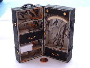 Een hutkoffer, gemaakt van karton en bekleed met heel dun suede. De binnenkant met een mooi (marmer-) papiertje beplakt. Papiertje was wel gekocht trouwens, net