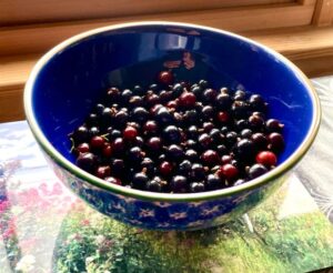 I’m not usually home for my blackcurrants – the birds take them when I’m on tour. Now what to do with them….. hmmm……. will they