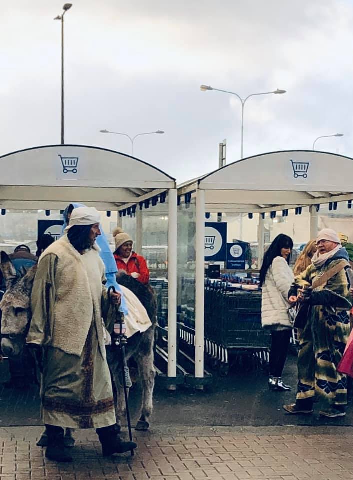 Joseph & Mary parking their ass with the trolleys in Tesco on Christmas Eve.