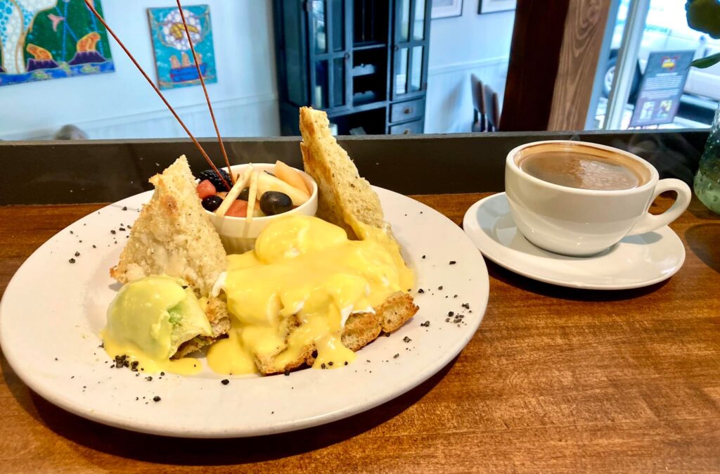 Delicious Crab & Avocad Benedict, withFruit Salad & Americano at Brioche in Gastown