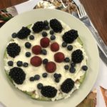 Leg de plakken watermeloen op een schaal of bord. Een dikke laag slagroom erop en dan garneren met het andere fruit.