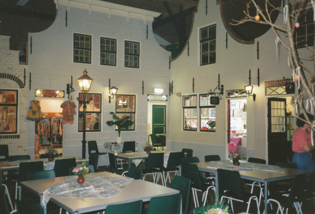 In een grote schuur zijn tegen alle muren (atelier)ruimtes gemaakt. De ‘gevels’ van deze ruimtes zijn Oudhollands. Dat geeft al sfeer. Je komt binnen op het pleintje. Hier kun je even zitten met een kop koffie of de lunch.
